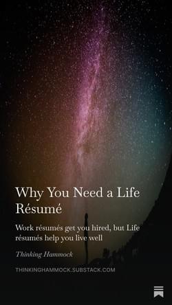Thinking Hammock is a reflective framework for intentional living that guides you through a personal life assessment, the creation of a Life Resume, and the writing of your own mission statement. It helps surface values, lessons, and memories that never appear on a work résumé but deeply shape who you are and how you want to live. Ultimately, it serves as a calm space to step back, reset, and align your decisions with what truly matters.