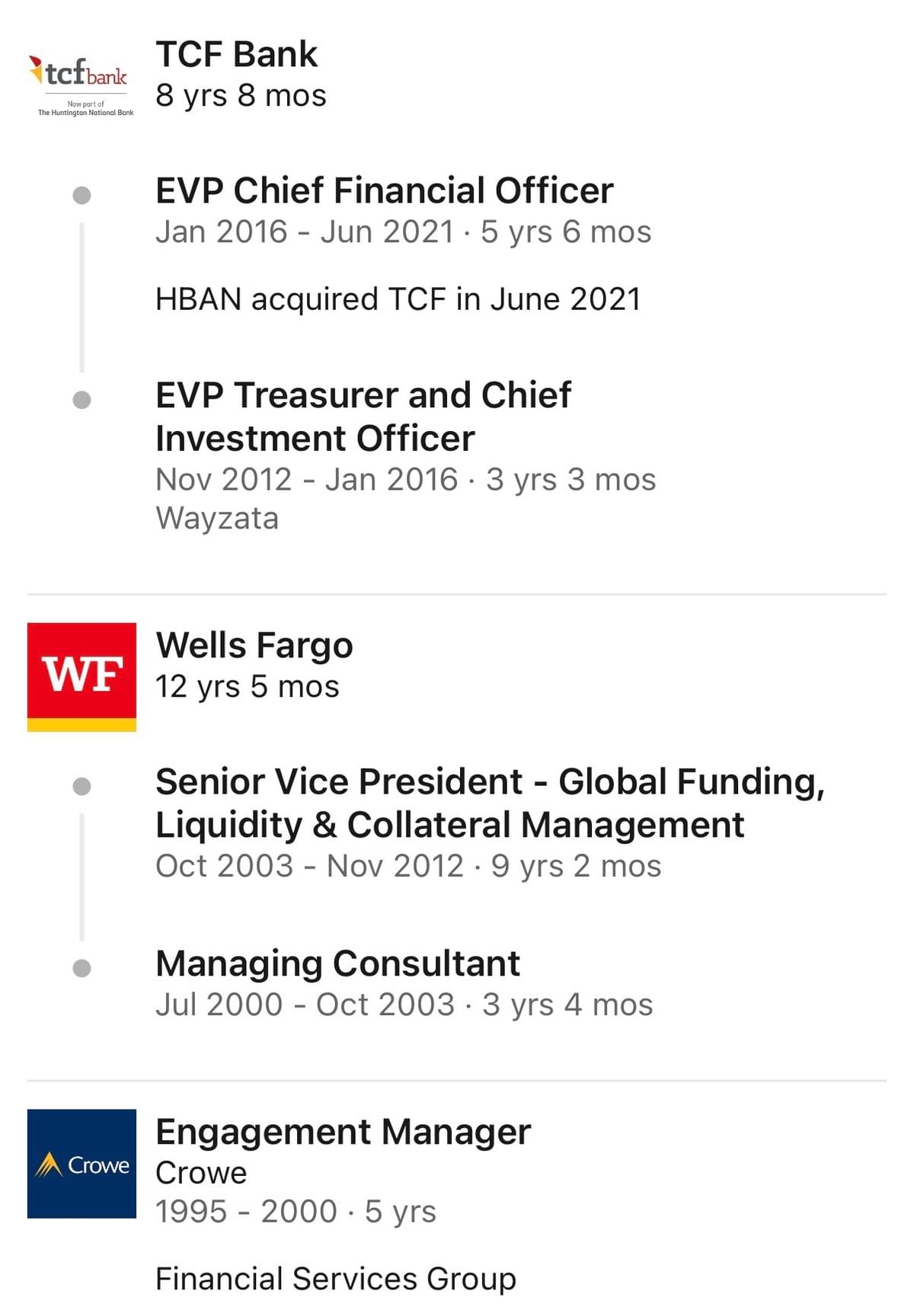 From there, I became Treasurer and Chief Investment Officer of a regional bank, then advanced to Chief Financial Officer for a publicly traded bank where I led multiple transformative mergers, increasing the bank’s size from $18 billion to $48 billion and helping position it to compete in a changing industry.